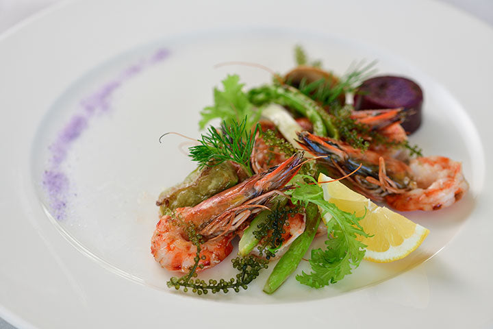 上品な甘みが特徴の沖縄県産の活き車エビを、殻まで食せる絶妙な火加減でソテー。車エビ本来の旨味と香りをより一層引き立てる、レモンと沖縄県産の島マースを添えてご提供いたします。