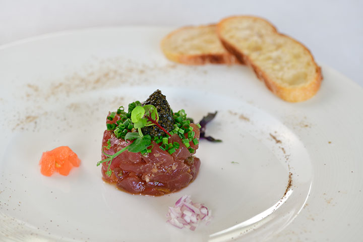 年間を通して沖縄各地の漁港で水揚げされる生マグロを使用。醤油ベースのソースにネギ、ケッパーや沖縄特産の香辛料・ピパーチを取り入れ、味わいの相乗効果を高めています。