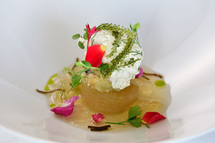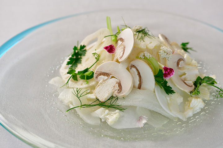 沖縄の健康長寿を支えてきた島野菜や豆腐料理に着目し、フレンチの技法を用いて、テラスならではのウェルネスキュイジーヌに仕立てました。ソースには昆布や椎茸を使用、植物由来の素材だけで滋味豊かに仕上げた消化にもやさしい一品です。