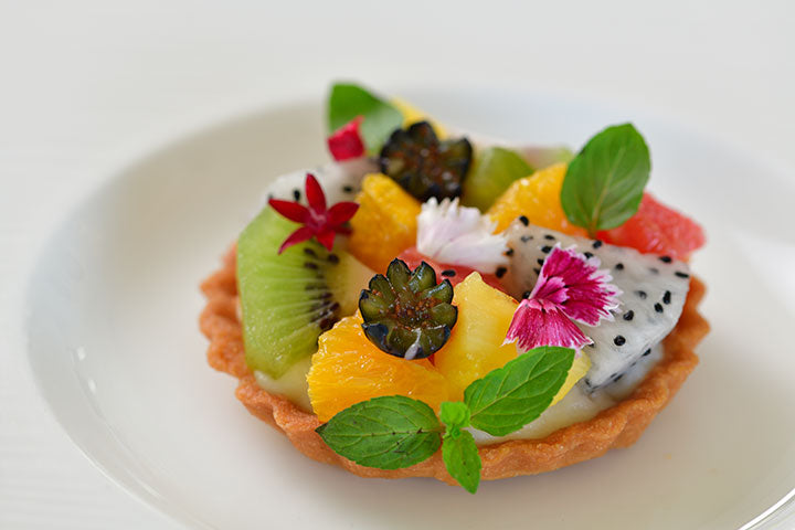 アーモンドが香るサクサクの生地に、沖縄県産のフルーツや旬の果実をたっぷり載せて。甘味にはミネラルを多く含むキビ糖と黒糖を使用、糖分を抑えながらもコクのある優しい味に仕上げました。