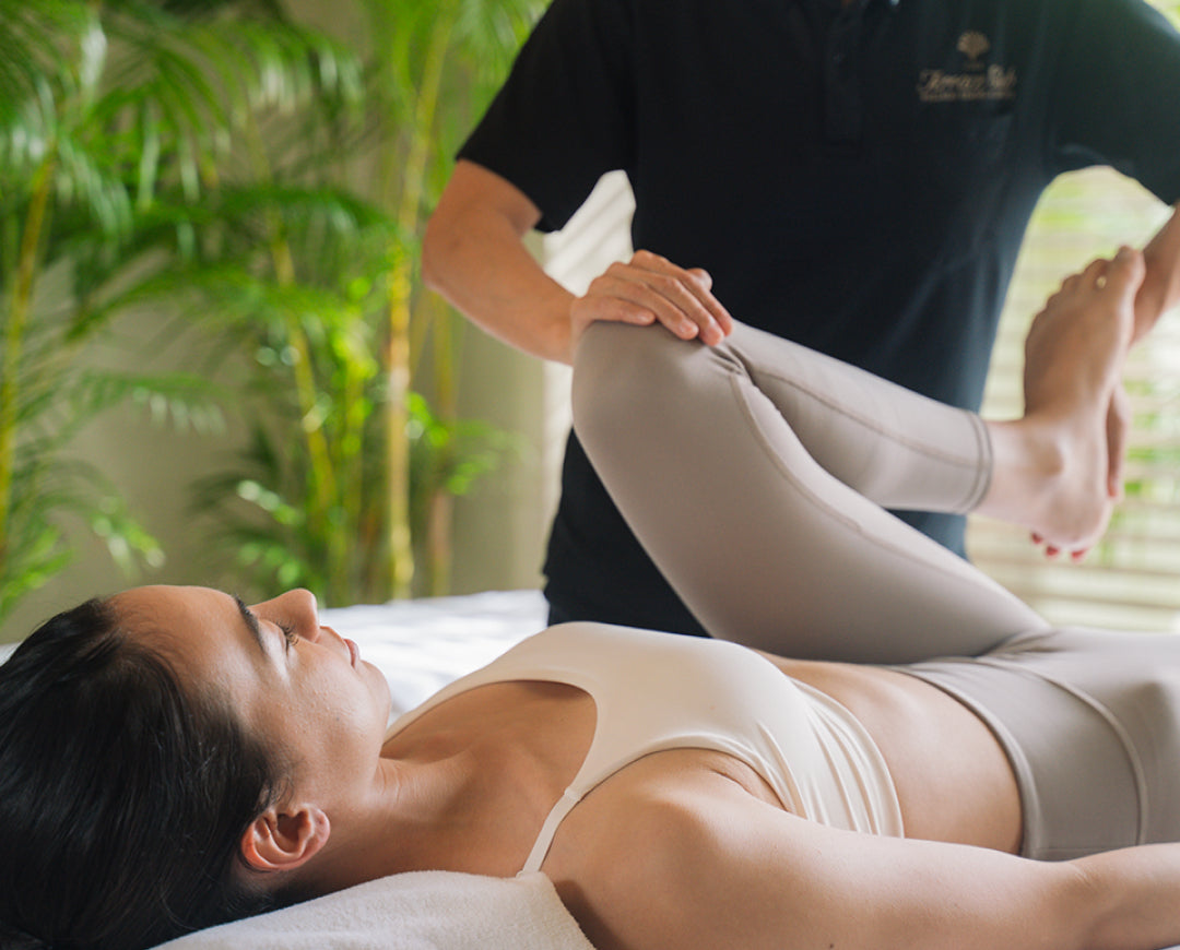 オイル等は使用せず、衣類の上からゆったりと施術します。意識的な呼吸を行うことで全身に酸素をいきわたらせた後、セラピストの手技に身を任せ、身体の深部にまで働きかける適度な圧とストレッチにより関節の可動域を高めていきます。